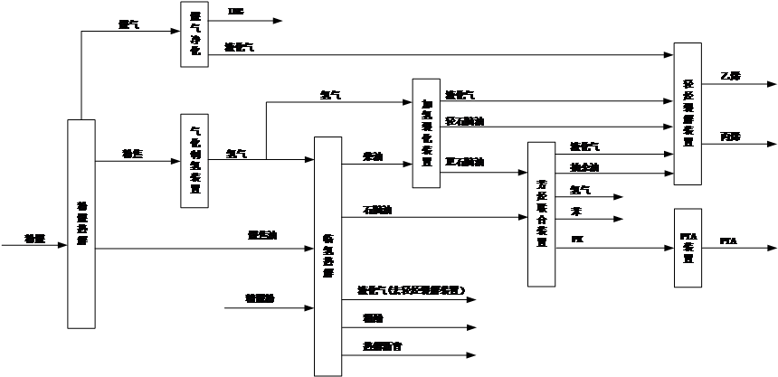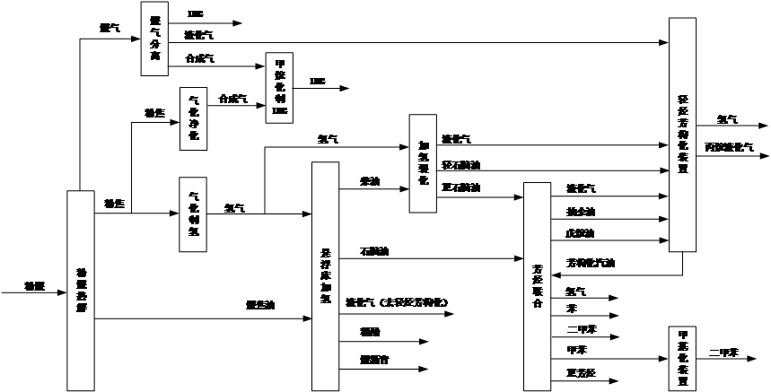 規劃以煤炭資源為基礎,將煤化工領域的粉煤熱解、焦油加氫、煤氣凈化以及石化領域的加氫裂化、芳烴聯合、輕烴芳構化等生產技術進行耦合,實現煤炭分質利用制芳烴,完成煤炭的分質、清潔、高效轉化,減少了對石油原料的依賴性,實現了煤代原油大批量生產芳烴的可能性。