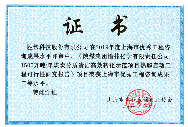 日前從上海市工程咨詢行業協會傳來喜訊,我司編制的《陜煤集團榆林化學有限責任公司1500萬噸/年煤炭分質清潔高效轉化示范項目熱解啟動工程可行性研究報告》榮獲2019年度上海市優秀工程咨詢成果二等獎。