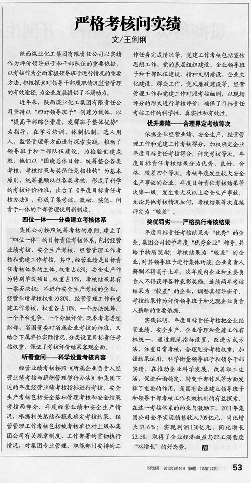 《當代陜西》2013年6月10日第6期陜煤化集團嚴格考核問實績陜西煤業化工集團有限責任公司以實績作為評價領導班子和干部隊伍的重要依據,以考核作為全面掌握領導班子運行情況的重要方法,積極探索對領導干部履職情況監督管理的有效途徑,為企業發展提供了不竭動力。近年來,陜西煤業化工集團有限責任公司堅持以“四好領導班子”創建為載體,以“提高干部綜合素質,發揮班子整體優勢…