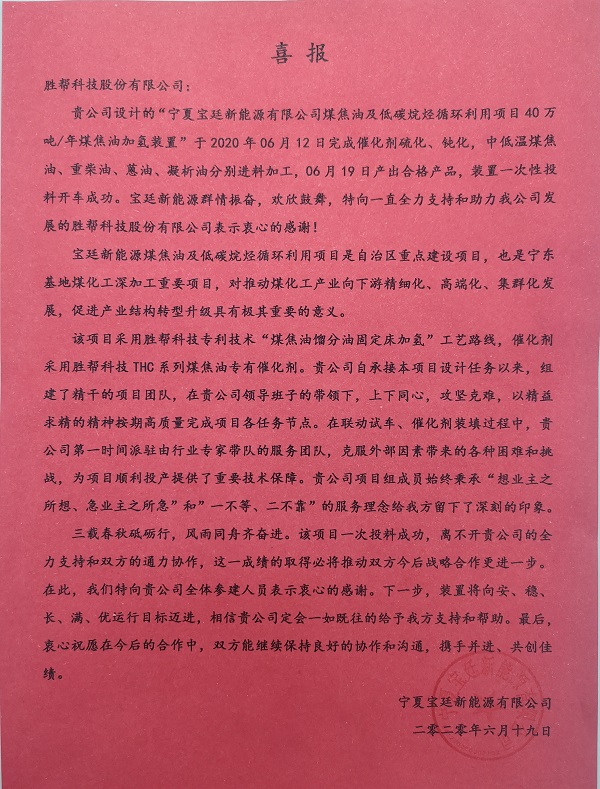 由勝幫科技設計的“寧夏寶廷新能源有限公司煤焦油及低碳烷烴循環利用項目40萬噸/年煤焦油加氫裝置”于2020年6月12日完成催化劑硫化、鈍化,中低溫煤焦油、重柴油、蒽油、凝析油分別進料加工,6月19日產出合格產品,裝置一次性投料開車成功。