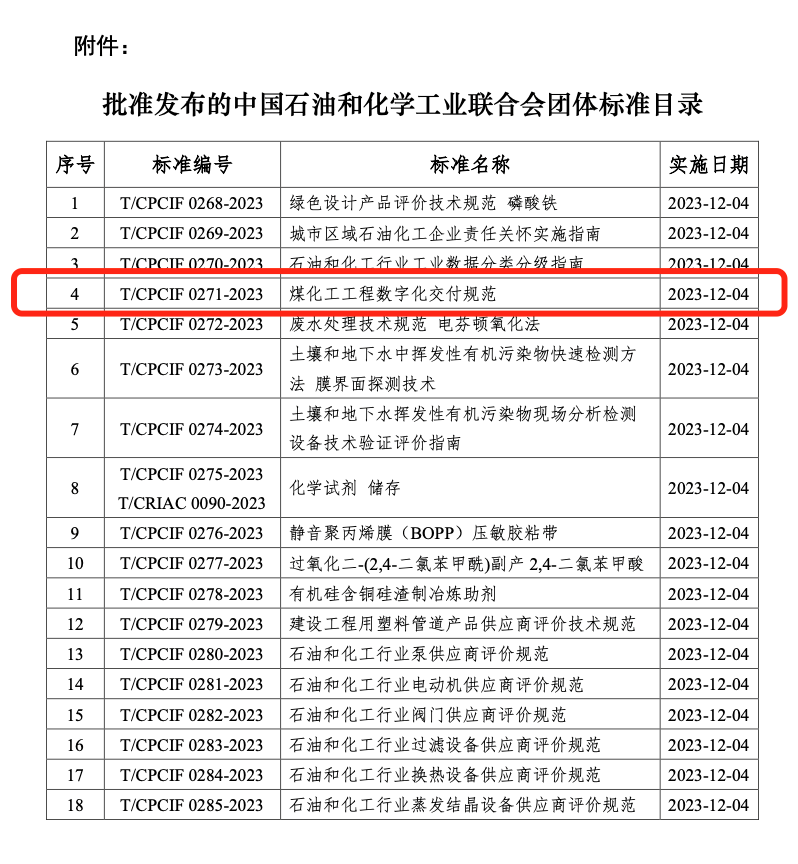 近日,由勝幫科技股份有限公司參與制定的《煤化工工程數字化交付規范》團體標準(T/CPCIF 0271-2023)通過中國石油和化學工業聯合會標準化工作委員會審查通過,于2023年9月4日正式發布,2023年12月4日起正式實施。