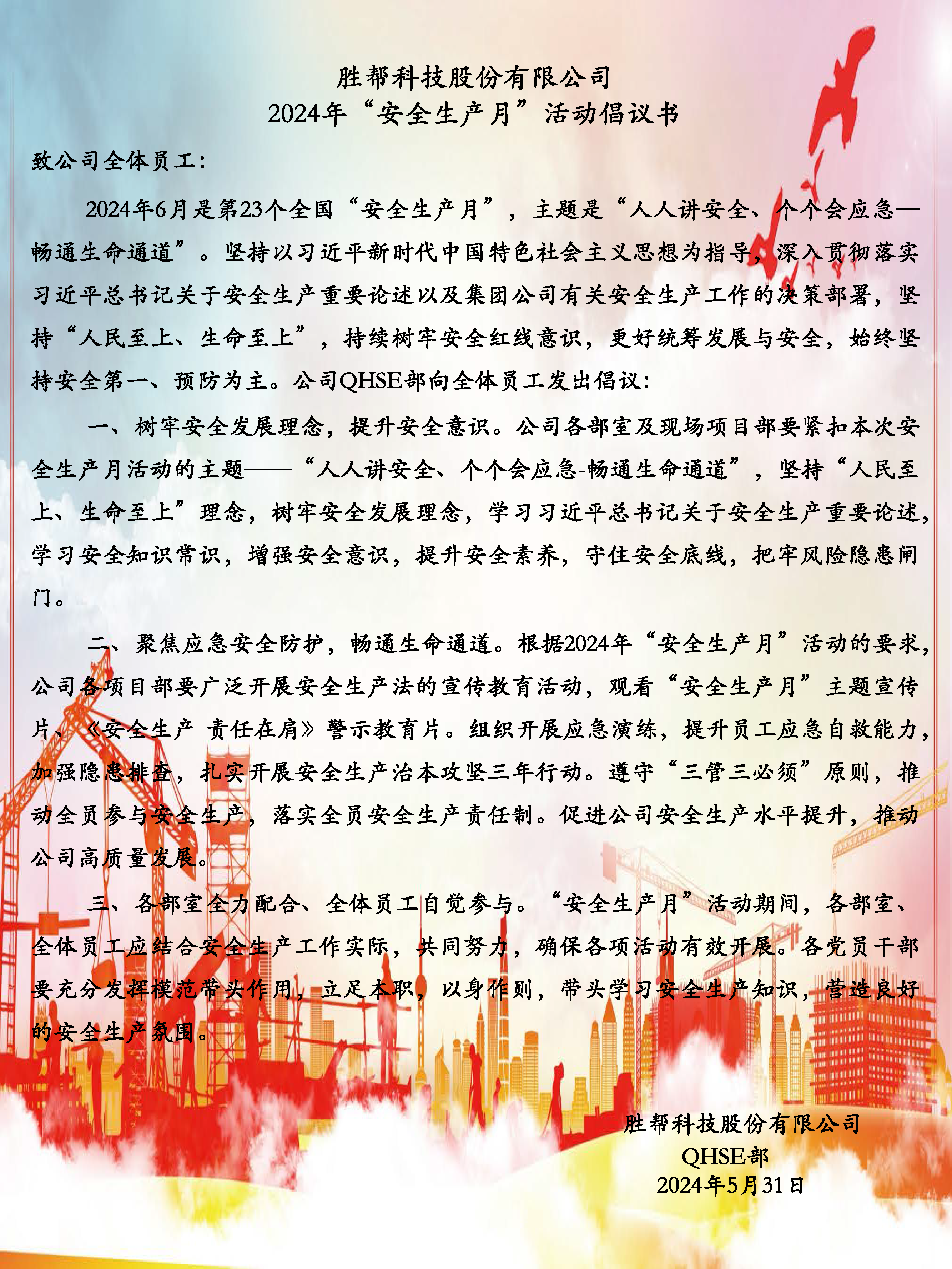 勝幫科技股份有限公司2024年“安全生產月”活動倡議書