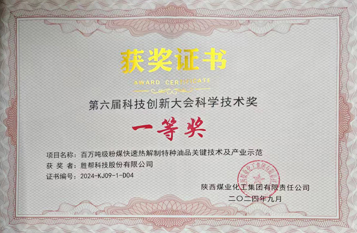 2024年9月2日,陜煤集團召開第六屆科技創新大會。勝幫科技股份有限公司和榆林化學等單位憑借《百萬噸級粉煤快速熱解制特種油品關鍵技術及產業示范》項目獲得陜煤集團2018-2023年科學技術獎一等獎。這一輝煌成績,是對勝幫科技股份有限公司全體科研人員長久以來辛勤耕耘的高度認可與褒獎。