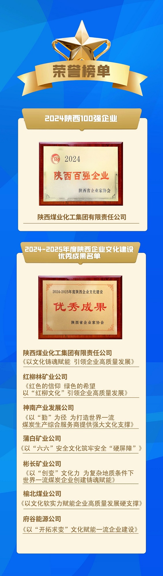 此外,陜煤集團所屬紅柳林礦業公司、神南產業公司、彬長礦業公司、北元集團、蒲白礦業公司、榆北煤業公司、府谷能源公司7家企業也同時入選2024-2025年度陜西企業文化建設優秀成果。(郭聰仡)