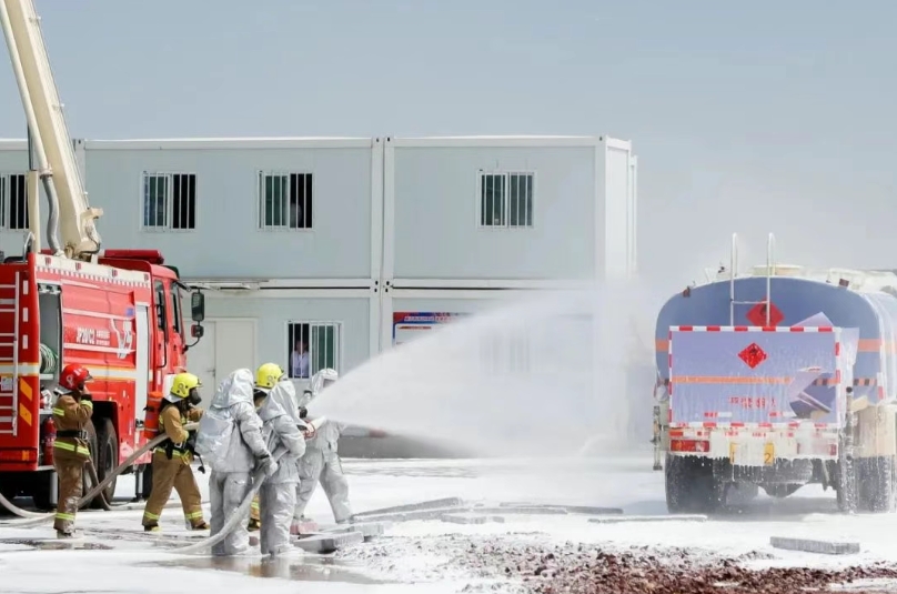 本次演練創新采用虛實結合、科技應用與第一視角模式,模擬腳手架坍塌、柴油罐車起火、丙烯球罐泄漏等多起事故,檢驗榆林化學與建設集團多類型事故并發處置能力。事故模擬發生后,兩家單位迅速啟動應急預案,充分發揮高科技設備與技術應用優勢,精準定位7名被困人員位置,聯動陜煤集團專業救援力量開展緊急救援。演練歷時一個半小時,成功解救并疏散“被困人員”,高效完成各項任務。