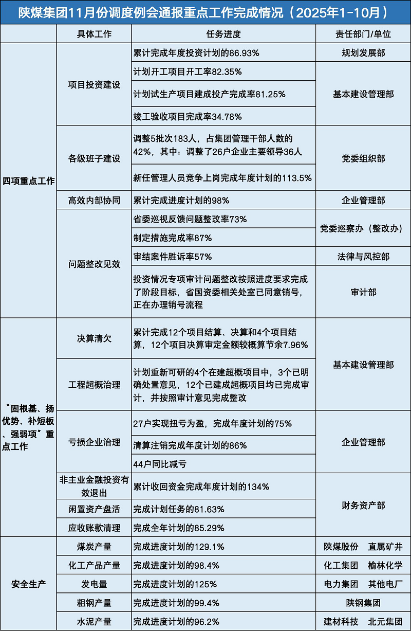 會(huì)議總結(jié)10月份重點(diǎn)任務(wù)完成情況,分析當(dāng)前工作存在的問題和不足,安排11月份重點(diǎn)工作;相關(guān)職能部門分別匯報(bào)了項(xiàng)目投資建設(shè)、高效協(xié)同發(fā)展、各級(jí)班子建設(shè)、各類問題整改及安全環(huán)保、生產(chǎn)經(jīng)營(yíng)、閑置資產(chǎn)盤活、虧損企業(yè)治理等重點(diǎn)工作推進(jìn)情況。