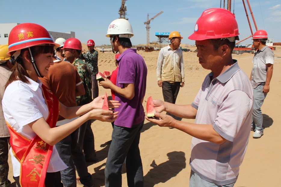 隨著夏季的來臨,氣溫的不斷升高,施工人員露天進行施工作業,體能消耗很大,其防暑降溫工作成為了重中之重。為保障施工人員身體健康,保證安全生產,我項目部連同業主單位特采取切實有效的防護措施,堅持以人為本,認真做好一線工人的防暑降溫工作。業主單位為每位員工和農民工朋友免費派發毛巾、涼茶、西瓜等防暑物品,避免中暑現象的發生。我項目部在送清涼活動中,積極進行了防暑降溫知識的宣傳活動,并通過采取多種有力措施進行防暑降溫,適當調整施工作業時間,根據當地氣溫情況,避開高溫時段,科學合理安排作息時間,切實保障施工人員在高溫天氣下的安全健康。