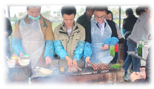 有經驗的“大廚”紛紛搶當爐頭,躍躍欲試,招攬“顧客”,瞧這幾位,那是相當專業,不僅有賣相,肉串烤得也非常棒,香酥可口。除了燒烤當然還有娛樂活動啦——麻將、撲克全上陣啦。