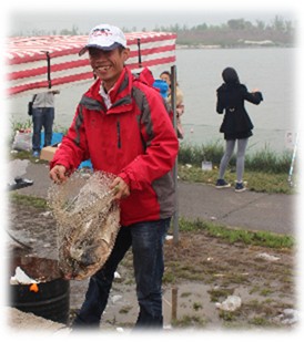 這邊玩得悠哉,烤得正嗨,那邊釣魚小組也不斷傳來捷報——上魚啦,上魚啦!釣魚小組的收獲越來越好,過一會就有魚上鉤。把魚拖到岸邊,再用抄網抄起。周圍的人都湊過來看看熱鬧,投來羨慕的眼光,大白鰱