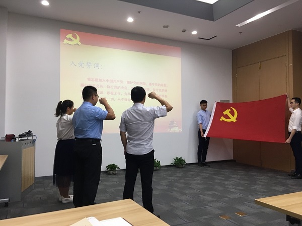 入黨宣誓儀式在令人熱血澎湃的《國際歌》后正式開始。主持人首先宣布了2018屆新預備黨員的名單,隨后由公司第二黨支部書記領誓,同新黨員同志一起面向神圣的黨旗,舉右手握拳,深情地宣讀了入黨誓詞。之后,由預備黨員代表作了激情昂揚的發言。
